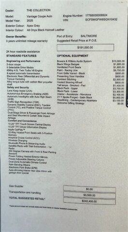 2025 Aston Martin Vantage $242k Window Sticker!